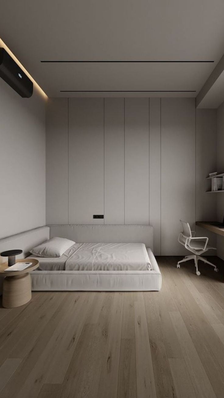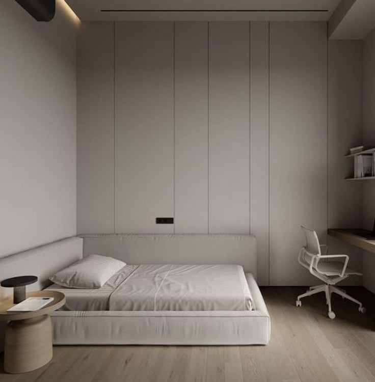 Dalam desain kamar tidur minimalis, pilih tempat tidur dengan desain modern dan penyimpanan yang terselubung, seperti lemari dengan pintu geser. Gunakan warna lembut untuk dinding dan bedding agar memberikan efek menenangkan saat tidur.